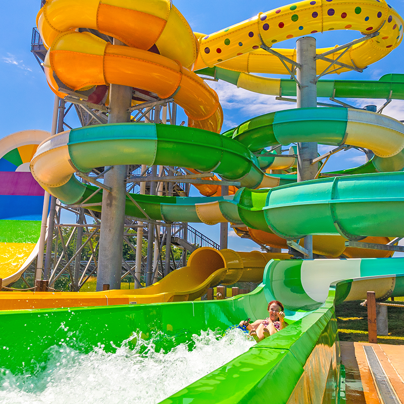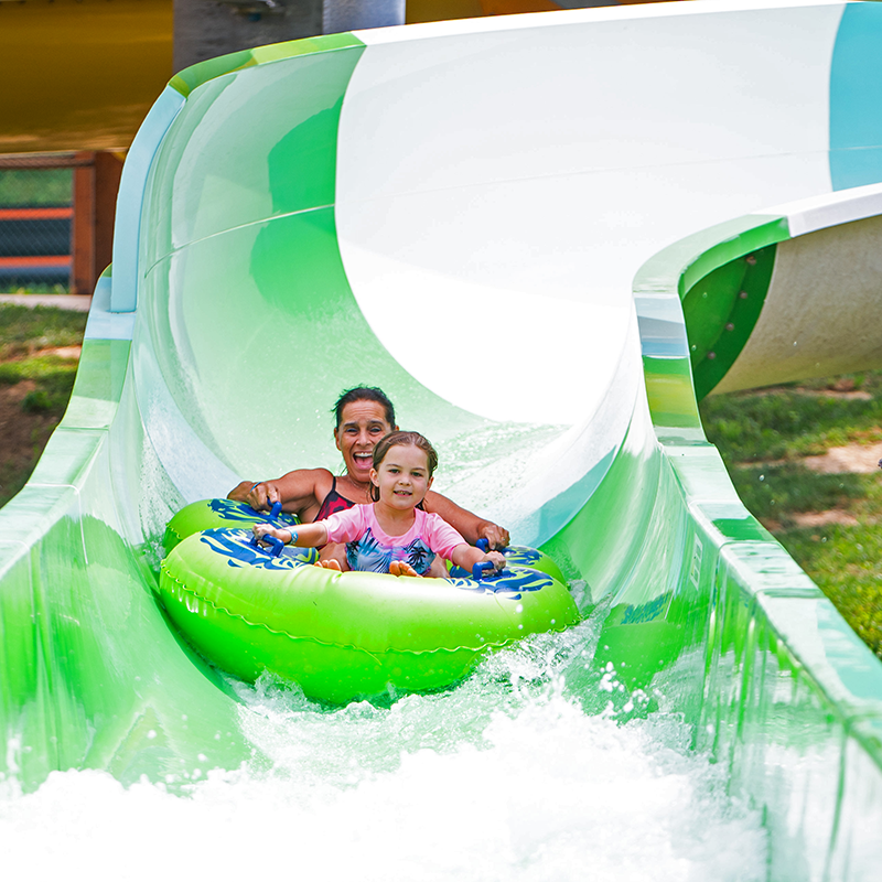 View booking info here.On this green & white open flume slide, sensational twists, turns, and drops create an exciting ride for everyone. This slide is built for single or double tubes for one or two riders at a time.