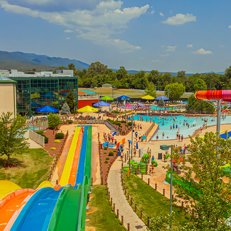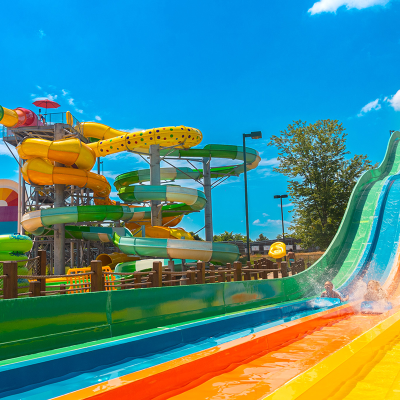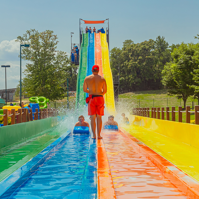 View booking info here.Let your competitive side run wild on this four-lane, headfirst, downhill water slide. Starting 40' up, grab a mat and race your friends and family 296-feet to the bottom.